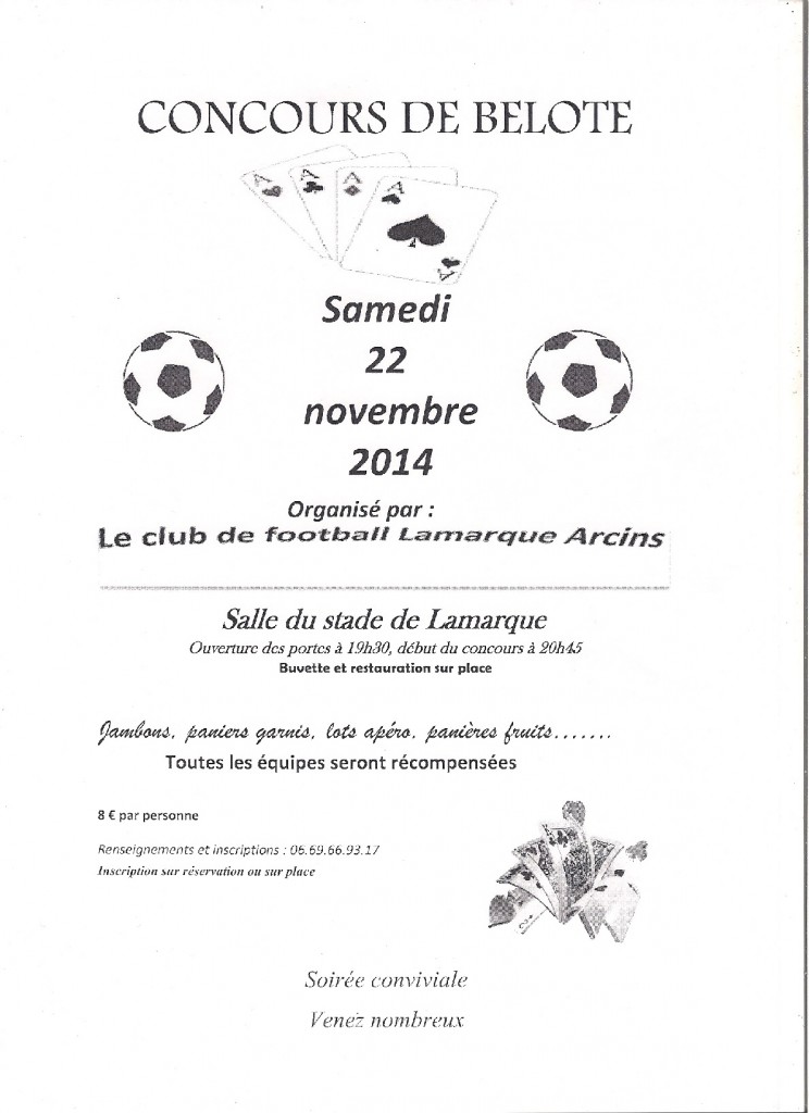 Un concours de belote est organisé samedi 22 novembre 2014 dans la commune de Lamarque, en Gironde (33).