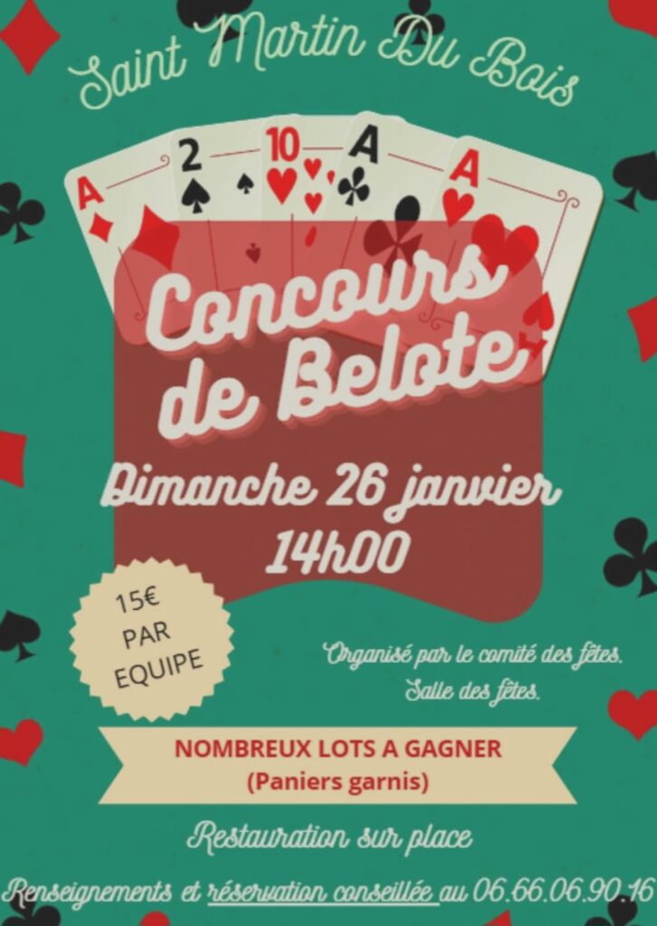 Le comité des fêtes de saint martin du bois organise un concours de belote le dimanche 26 janvier 2025 a la salle des fêtes de Saint Martin du Bois. De nombreux lots à gagner. Inscription conseillée au 06.66.06.90.16. Restauration et buvette sur place.