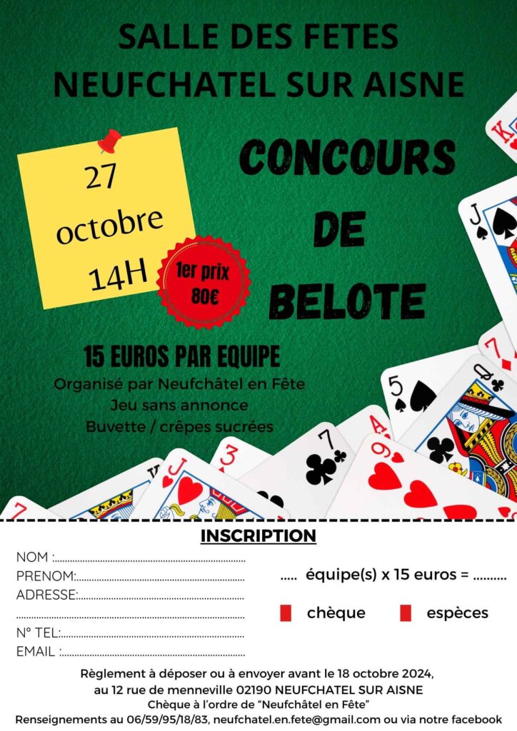Neufchâtel en Fête organise un concours de belote dimanche 27 octobre à 14h en la salle des fêtes de Neufchâtel sur Aisne.