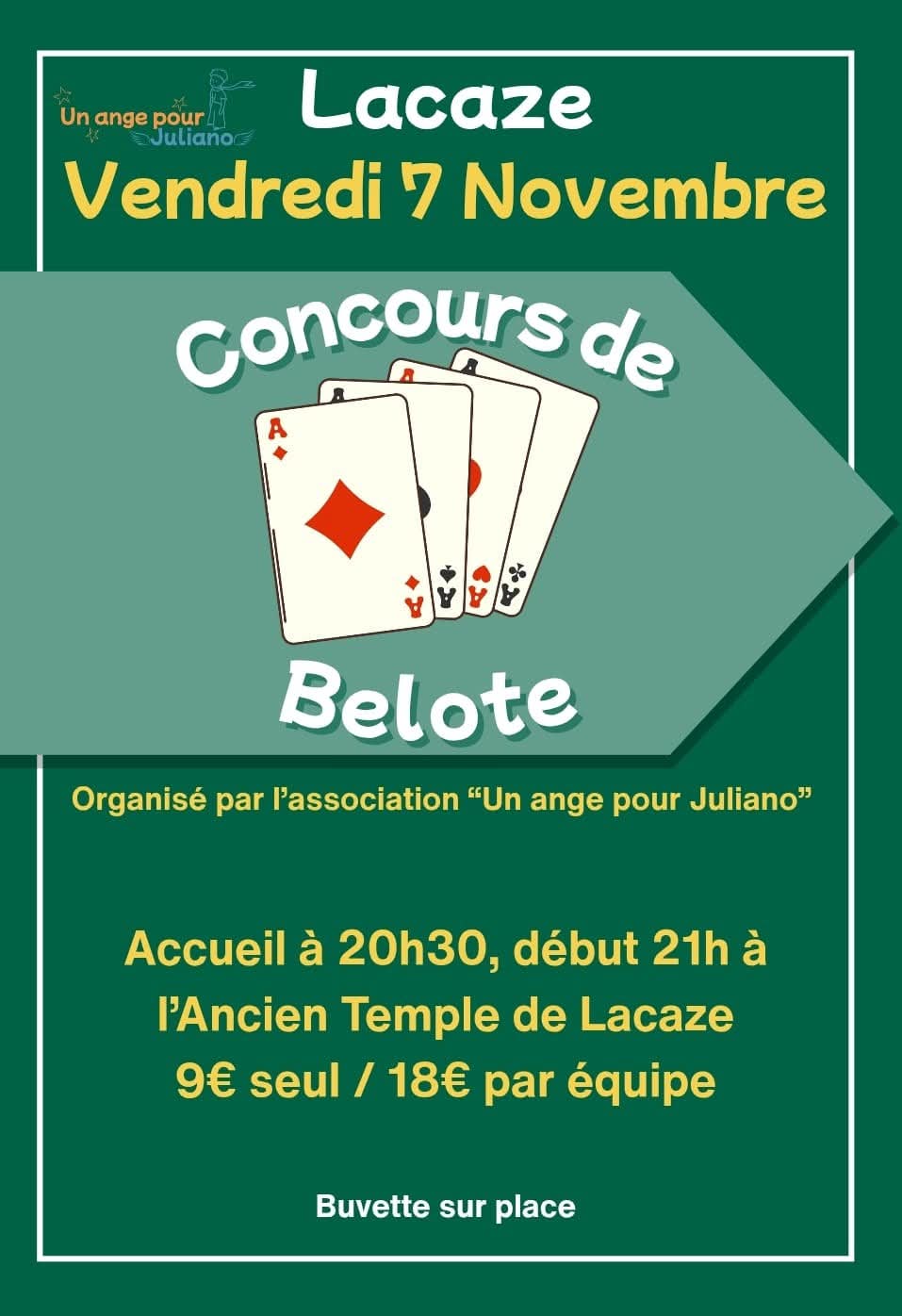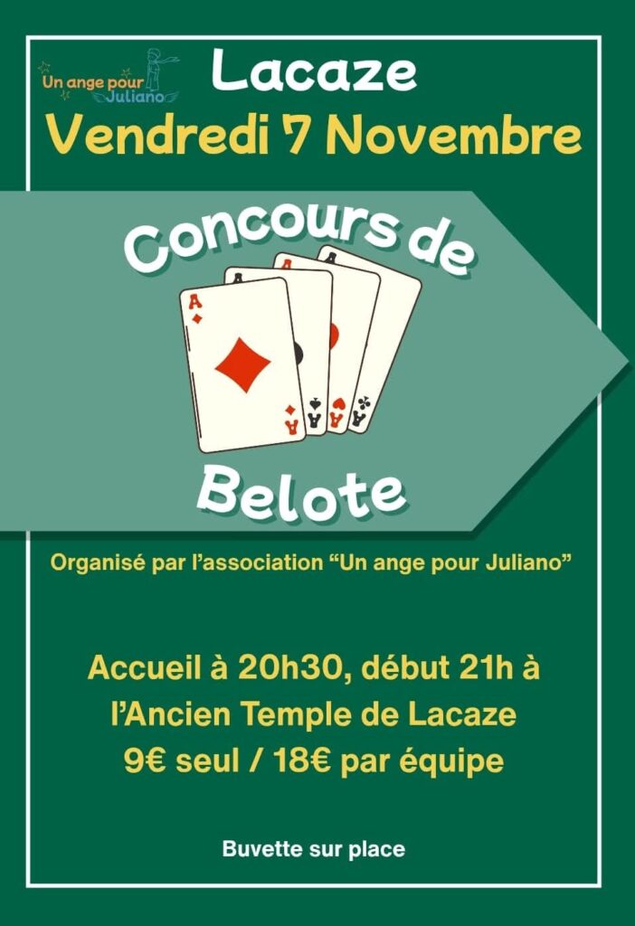 Concours de Belote le vendredi 07 novembre a l’ancien Temple de Lacaze, inscriptions a partir de 20h30, début du concours a 21h. 9 euros seul et 18 euros par équipe.Buvette sur place. Organisé par l’association Un Ange pour Juliano.
