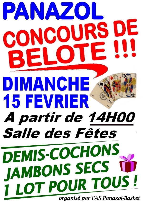 On nous annonce un concours de belote dimanche 15 février 2015 dans la commune de Panazol, en Haute Vienne (87).