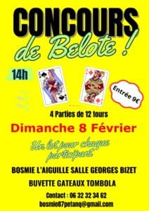 Haute Vienne (87) Concours de belote le 08/02/2026 à Bosmie‑l’Aiguille – Haute‑Vienne (87) Détails du concours »