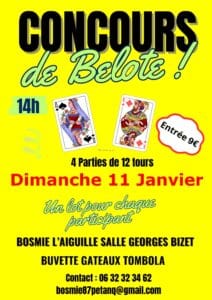 Haute Vienne (87) Concours de belote le 11 Janvier 2026 à Bosmie l’Aiguille – Haute Vienne (87) Détails du concours »