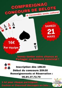 Haute Vienne (87) Concours de belote samedi 21 mars 2026 à Compreignac – Haute Vienne (87) Détails du concours »
