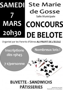 Landes (40) Tournoi de belote samedi 7 mars 2015 à Sainte Marie de Gosse – Landes Détails du concours »