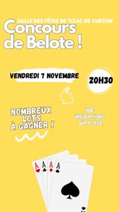 Gironde (33) Concours de belote le 7 novembre 2025 à Tizac de Curton – Gironde (33) Détails du concours »