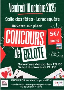 Haute Garonne (31) Concours Belote vendredi 10 octobre 2025 à Lamasquère – Haute Garonne (31) Détails du concours »