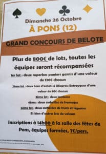 Aveyron (12) Tournoi de Belote le 26 octobre 2025 à Pons (12140 Saint Hippolyte) – Aveyron Détails du concours »