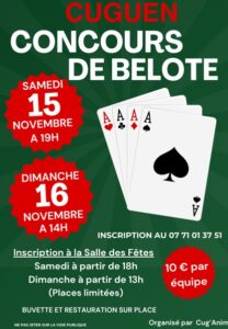Ille et Vilaine (35) Concours de belote le 15 novembre 2025 à Cuguen – Ille et Vilaine(35) Détails du concours »