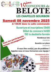 Seine et Marne (77) Tournoi de belote le 8 novembre 2025 à Les Chapelles Bourbon – Seine et Marne (77) Détails du concours »
