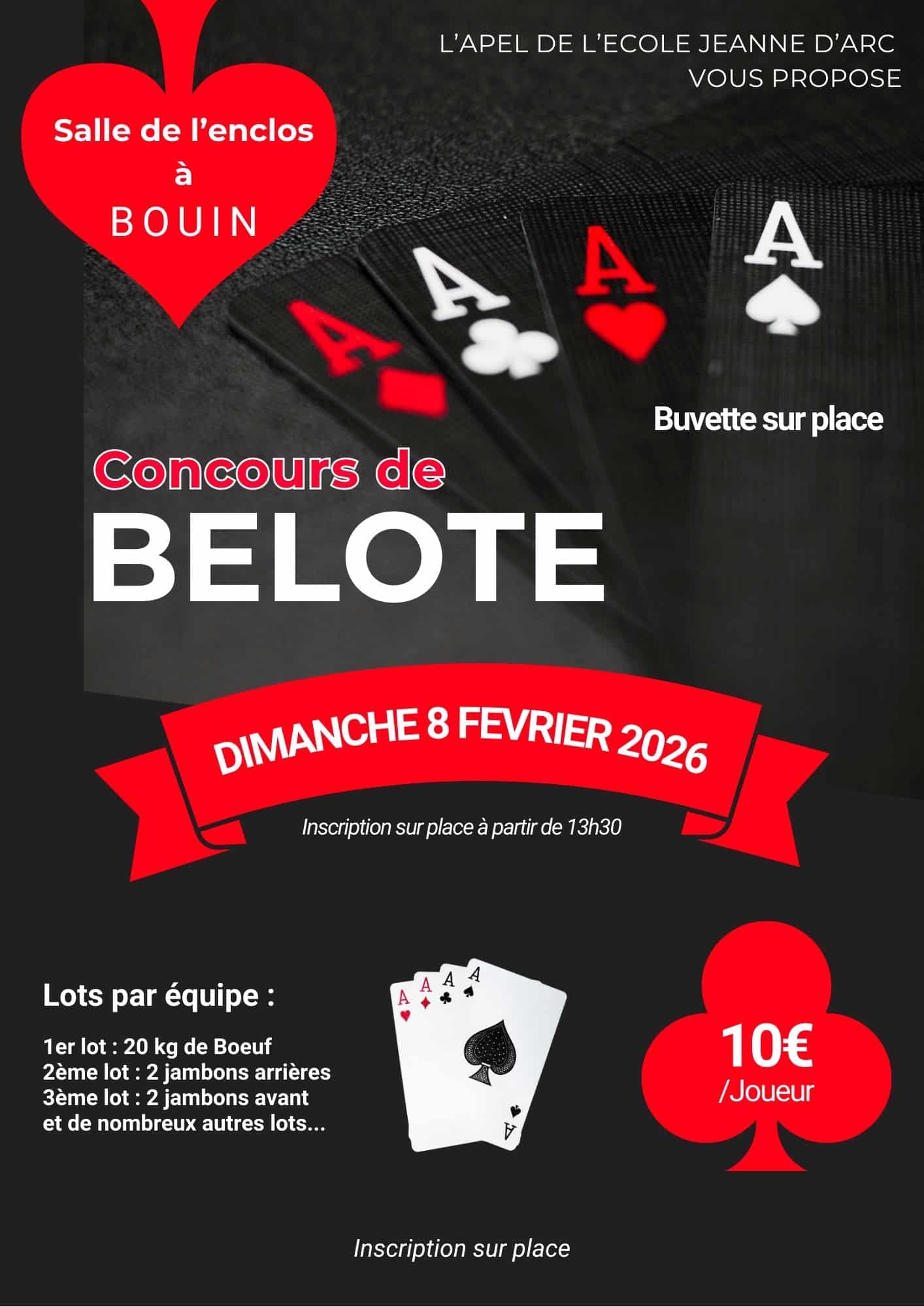 L’APEL de l’école Jeanne d’Arc de Bouin organise son concours de Belote.