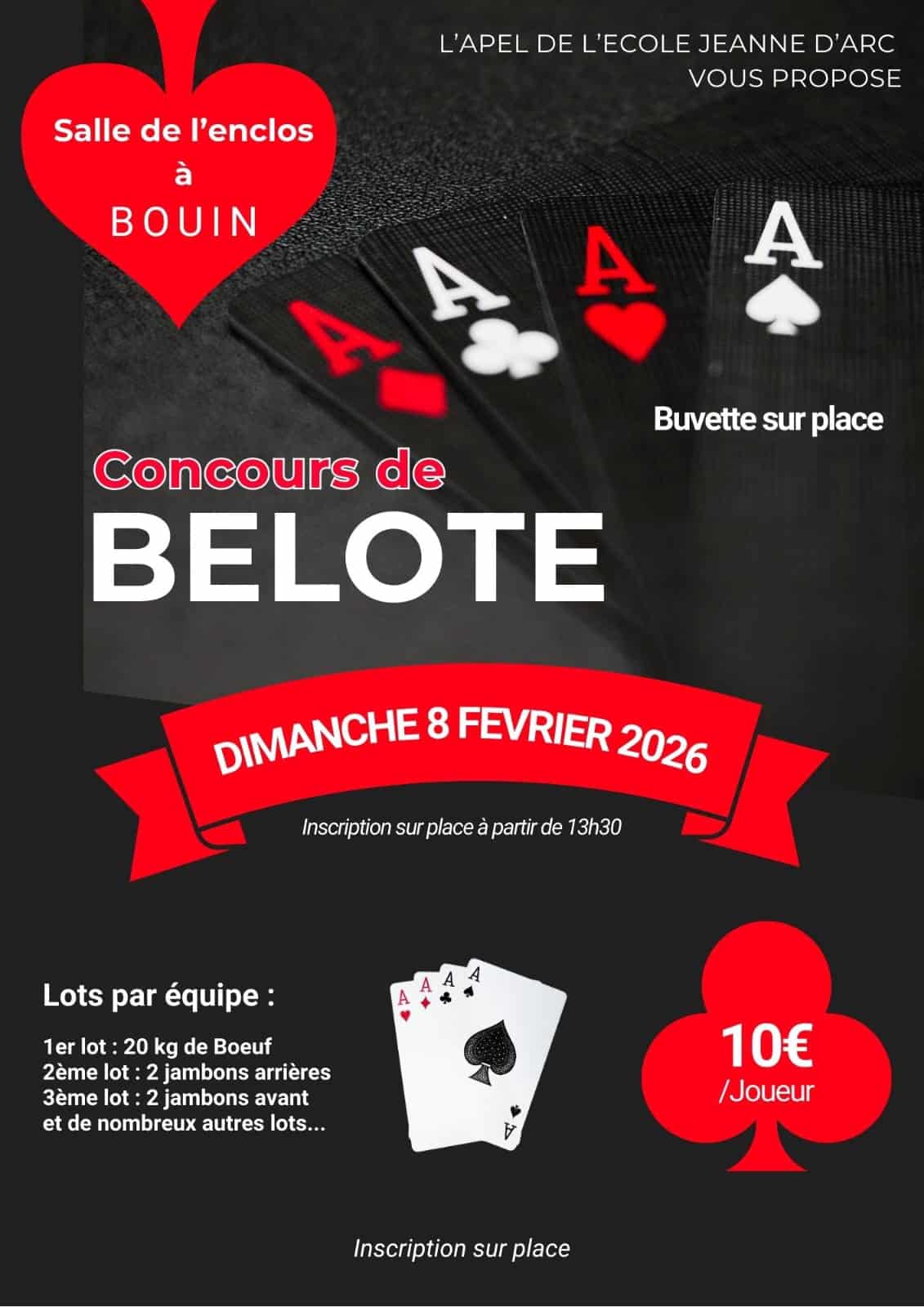 l’APEL de l’école de Bouin, vous invite à participer à son concours de belote pour y gagner 20kg de boeuf pour le grand gagnant et de nombreux autres lots pour tous.